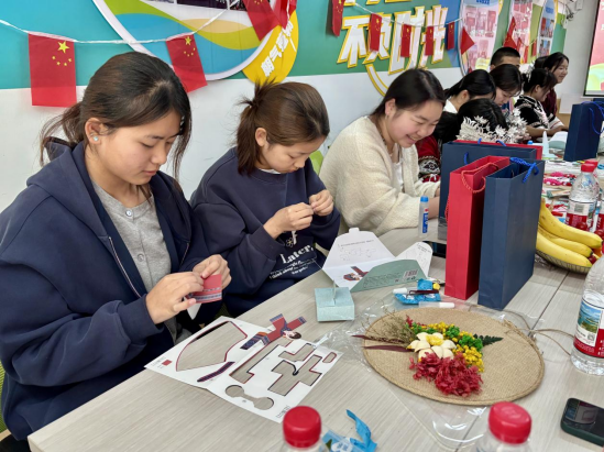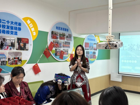 民族文化宣传片《多彩中华》,以影像语言呈现各民族独特建筑、服饰与节庆文化,师生沉浸于多元文化的交融之美。手工文化作品展示环节,学生带来苗族蜡染布艺、壮族服饰折纸、苗族文化瑰宝苗绣等10余件作品,搭建起一面“民族文化微展墙”。土族学生牟恩曲展示传统剪纸艺术,一幅“石榴抱籽”图案寓意各族同胞紧密相连,吸引师生驻足赞叹。