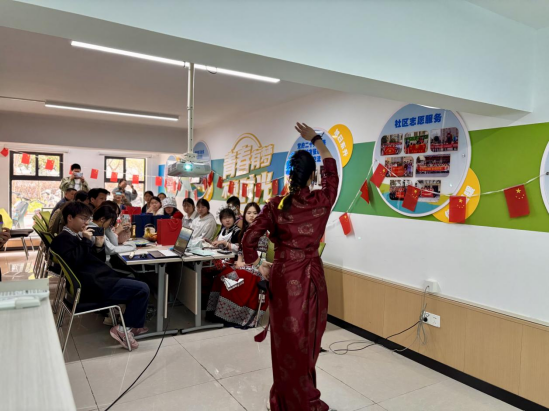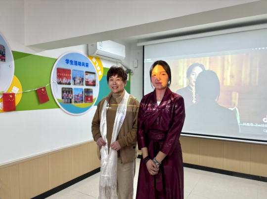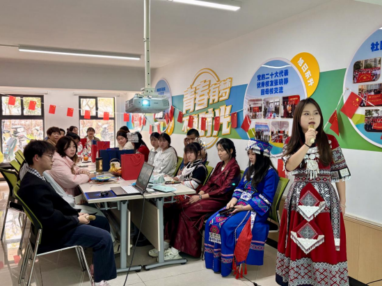 苗族学生刘萍星身着传统服饰,以生动的语言讲述苗族苗年的历史与习俗,展现苗族人民对自然的敬畏与对丰收的祈愿;土家族学生雷金讲解民族非物质文化遗产项目,土家织锦(西兰卡普)、土家摆手舞、土家山歌、梯玛歌等,带领大家走进独具魅力的“土家文化长廊”,领略“以歌养心、以舞传情”的民族精神。藏族学生牛金花向老师敬献哈达,跳起经典舞蹈《吉祥如意》,舞姿轻盈如云,长袖翻飞间尽显雪域儿女对幸福生活的礼赞,赢得现场阵阵掌声。